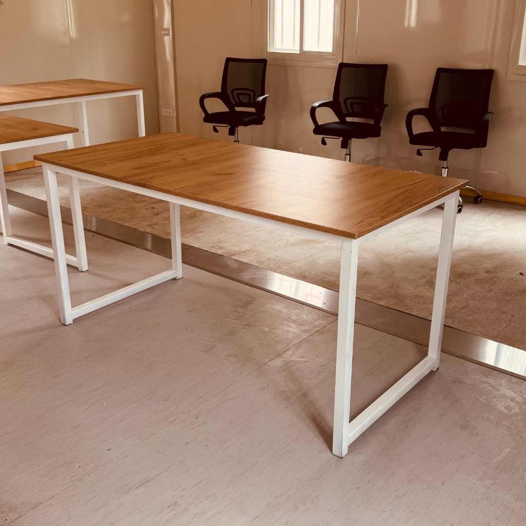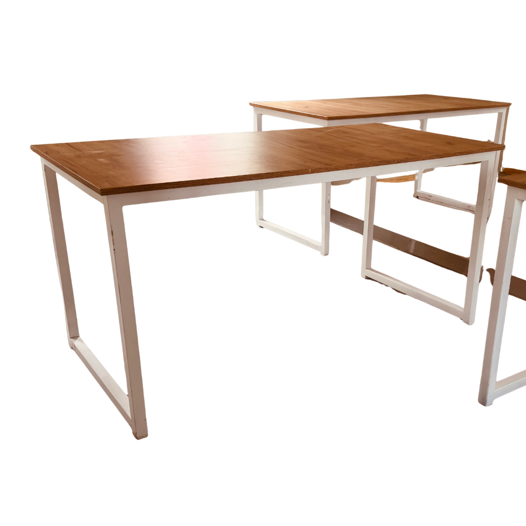 Alquiler de Mesa Melamina, Mesa Industrial Gerencial, Mesa Melamina Gamer color Caral y Base de Metal Color Blanco.